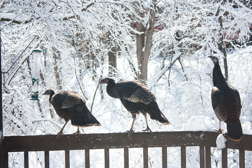 This is the first year Nick and I have had a bird feeder in our yard. We were surprised by how quickly the bird seed needs to be refilled. At least every three days, if not every two days. It was hard to understand why we had to fill it so much. We mostly see chickadees, cardinals, and some blue jays eating. Although they tend to go back multiple times, they are not large birds, so it was a bit confusing. Since we’ve never seen a squirrel anywhere near the feeder, we just thought it had to be the blue jays who were consuming so much. They did seem to be around the most, and they are the biggest birds that we had seen at the feeder. And then this weekend, we saw the turkeys…