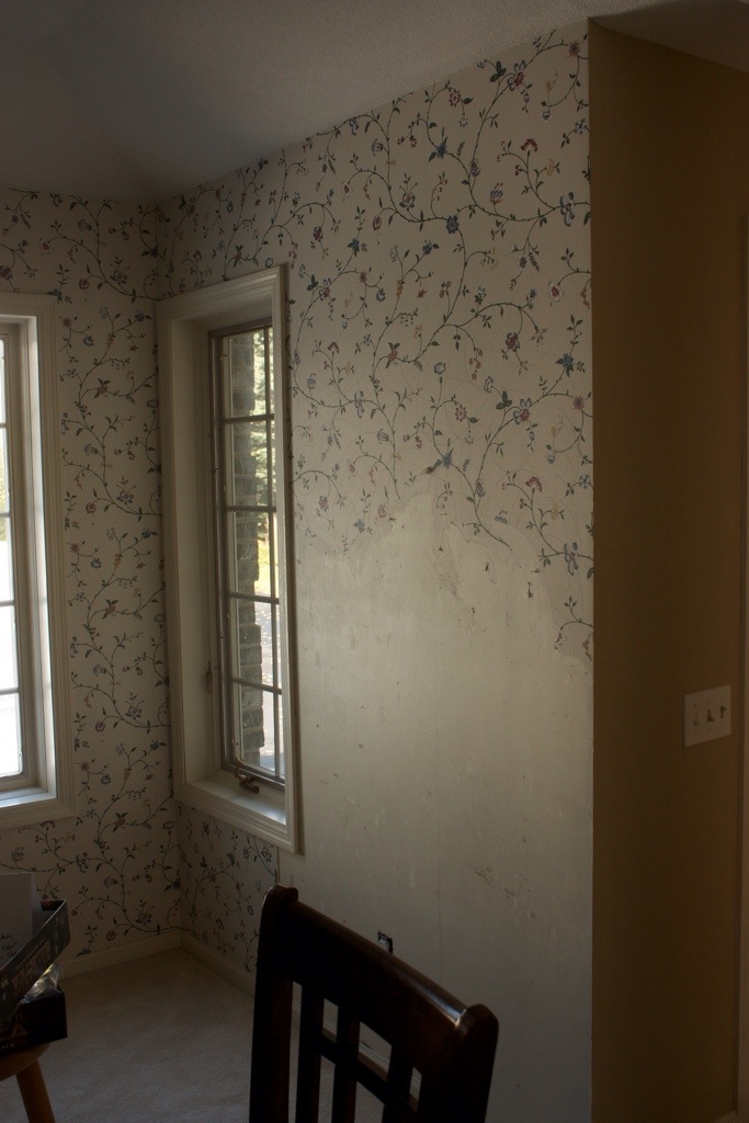 A few of weeks ago, we hired some people to remove the wallpaper in our dining room and bathroom. The original plan was that I was going to do the removal, but after hours of work and a beat up wall, we decided it would be best to hire someone. Especially since we would probably have to hire someone anyway to repair the mess I made of the wall!